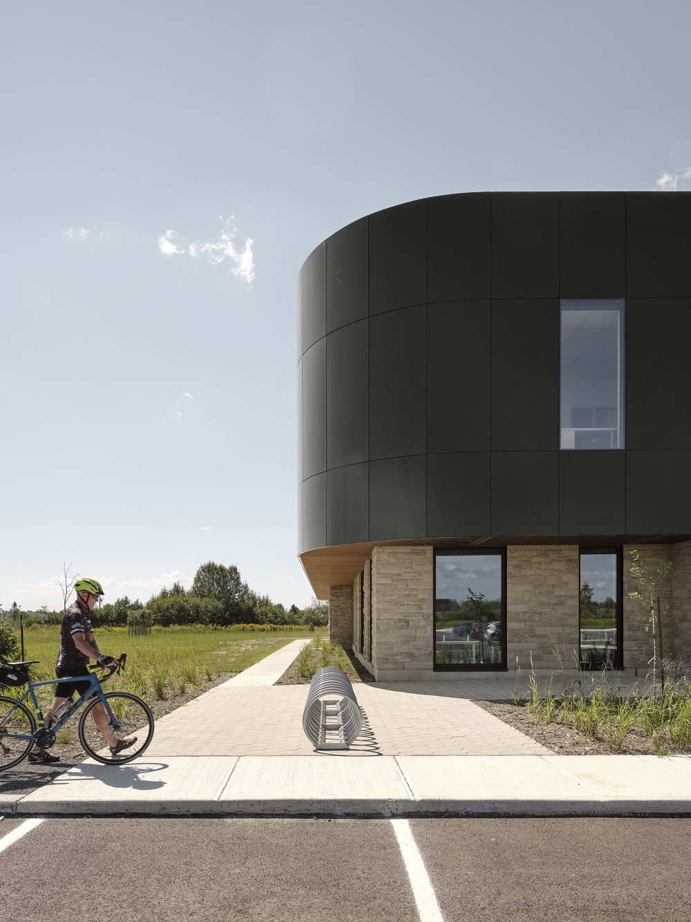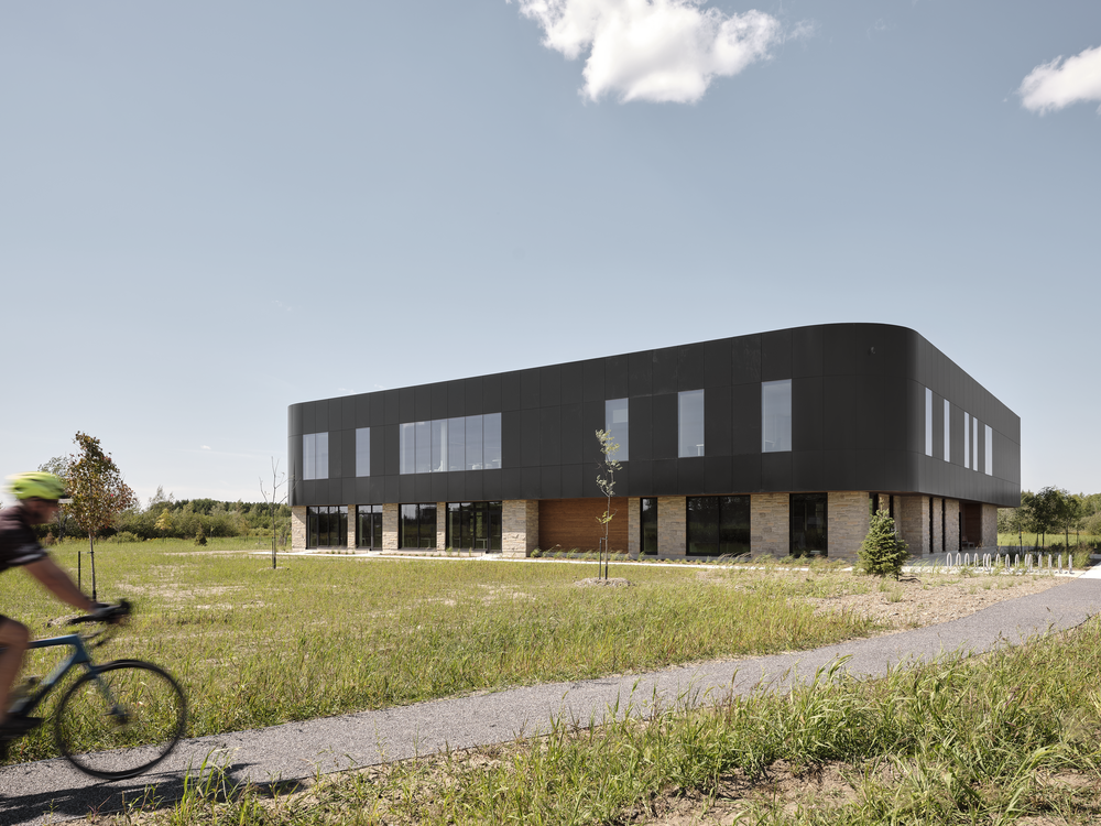 L’Incubateur Bromont illustre une juxtaposition maîtrisée entre mur-rideau et Multifaçades, au service d’une architecture lumineuse et cohérente. Le projet combine des surfaces vitrées stratégiquement positionnées et une enveloppe extérieure rythmée par un contraste marqué entre le rez-de-chaussée et l’étage.