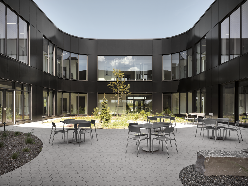 Une particularité marquante du projet réside dans les panneaux Multifaçades à l’étage, qui épousent la courbe du bâtiment sans briser la continuité de la façade. Les courbes se prolongent ensuite vers la cour intérieure, où le mur-rideau prend le relais pour favoriser un maximum de lumière naturelle.